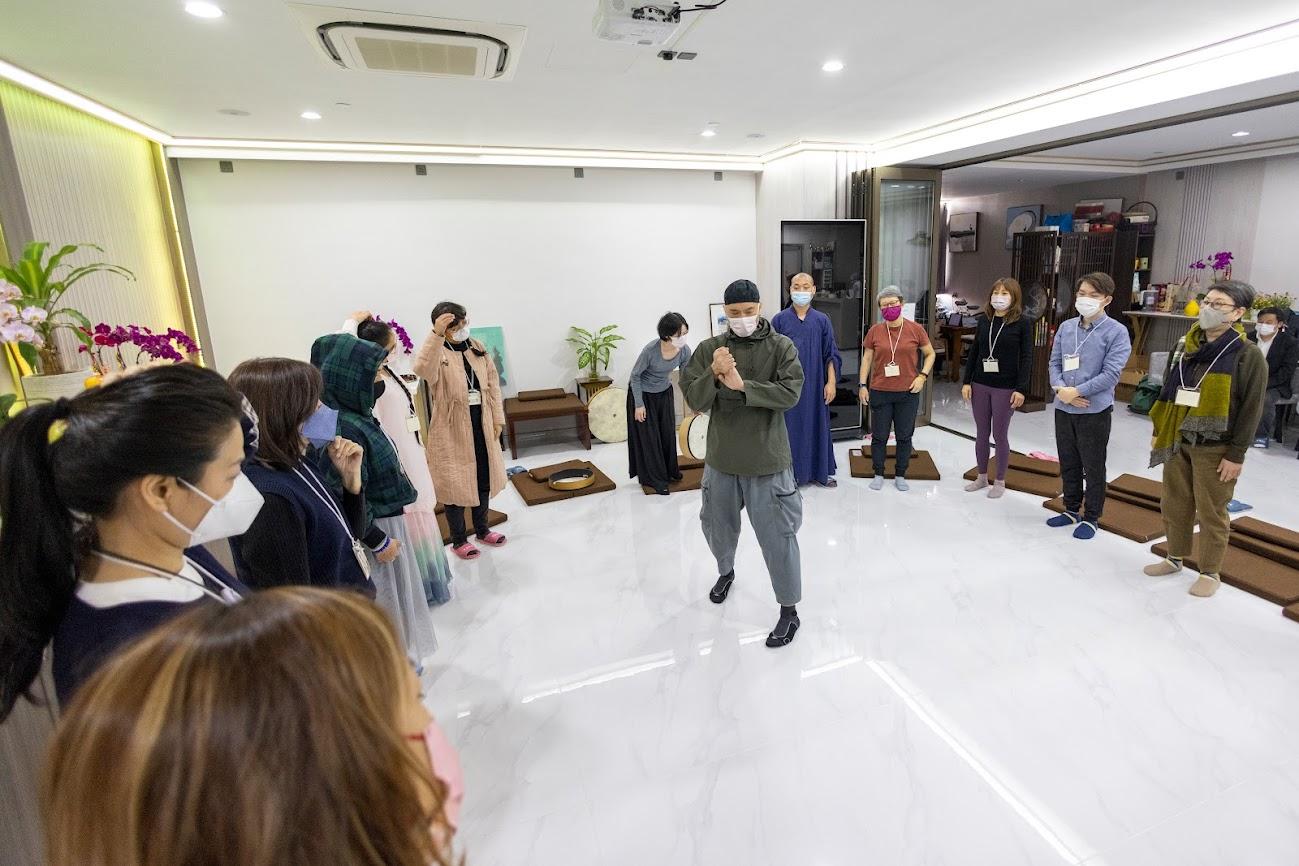 覺韜法師在交流環節與參加者分享:「每人第一次聽到的鼓聲其實是媽媽的心跳聲,鼓聲和我們心跳的聲音很像。大家在擊鼓的時候,體驗到隨著節奏加快,心情也會變得緊張,心跳也會變得更快,所以母親懷孕時情緒如有波動,腹中胎兒也是能感受到這樣的心跳聲,並受到影響。」有參與者聯想到自己的母親,深受觸動。鼓聲與心聲的相應,或許是許多參與者們不曾想到的聯繫。